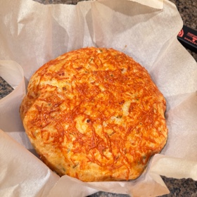 Once the oven reaches 450 degrees, carefully remove the dutch oven/baking dish. Remove the tea towel from the dough ball and lightly coat the top of the dough with the ½ tablespoon of olive oil. Sprinkle the top of the dough ball with shredded parmesan and some freshly chopped rosemary.