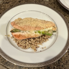 Place four asparagus spears down the center of each chicken breast, then top with mozzarella. Roll chicken around fillings to make tidy, compact rolls. Transfer chicken, seam-side down, to the prepared baking dish and sprinkle seasoning then bread crumbs over top.