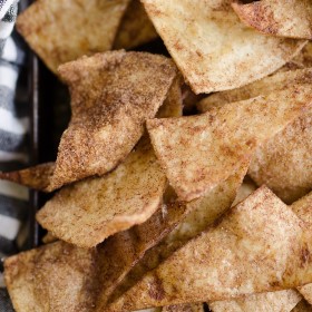 • In a small bowl combine the cinnamon and sugar. Toss the mixture over the buttered tortillas. Place the lid back on the bowl and shake well. Separate any tortillas stuck together and re-shake to ensure they are all coated well.