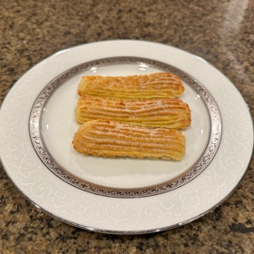 Add eggs and vanilla extract to the mixing bowl and mix using an electric hand mixer or stand mixer until dough comes together. The mixture will look like gluey mashed potatoes. Use your hands to press lumps together into a ball and transfer to a large piping bag fitted with a large star-shaped tip.